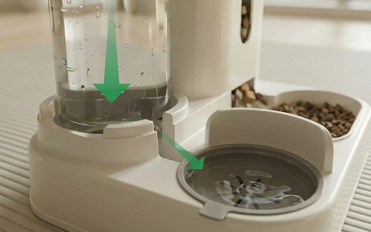 Automatisk system fylder skålen uden overløb. Kæledyr nyder frisk vand, selv når du ikke er hjemme.