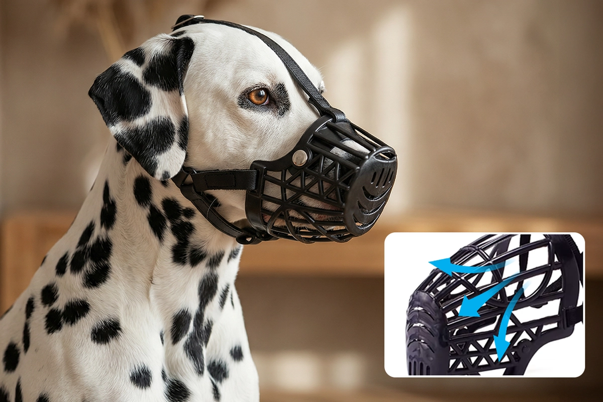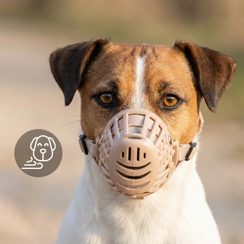 Blid pasform og efterlader aldrig mærker på min beagles snude. Rengøring er hurtig og nem. Jeg har det godt med at bruge den hver dag.