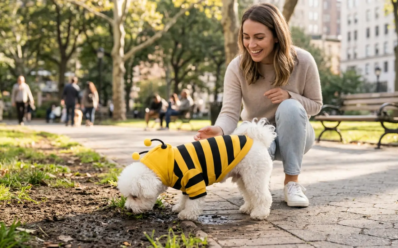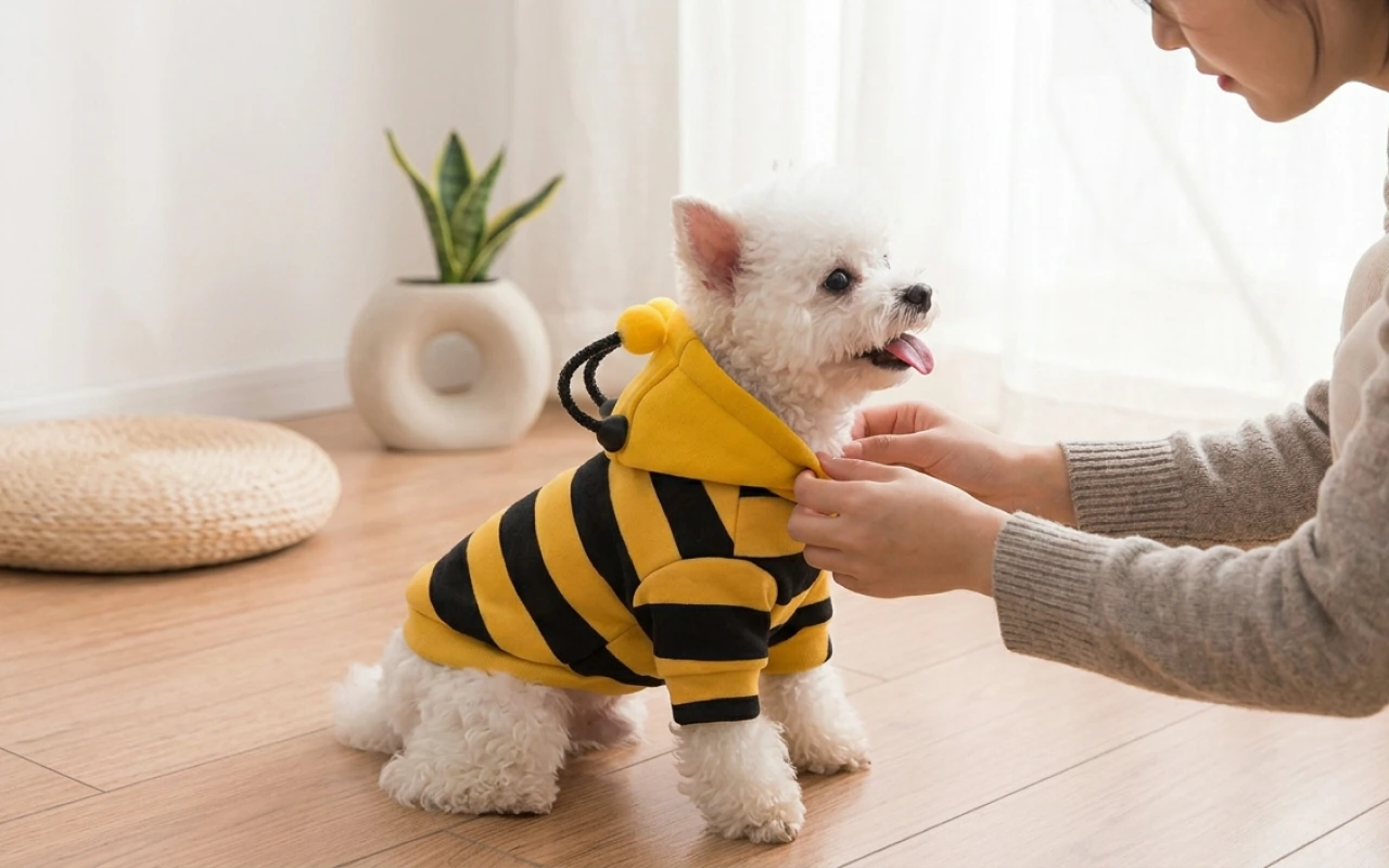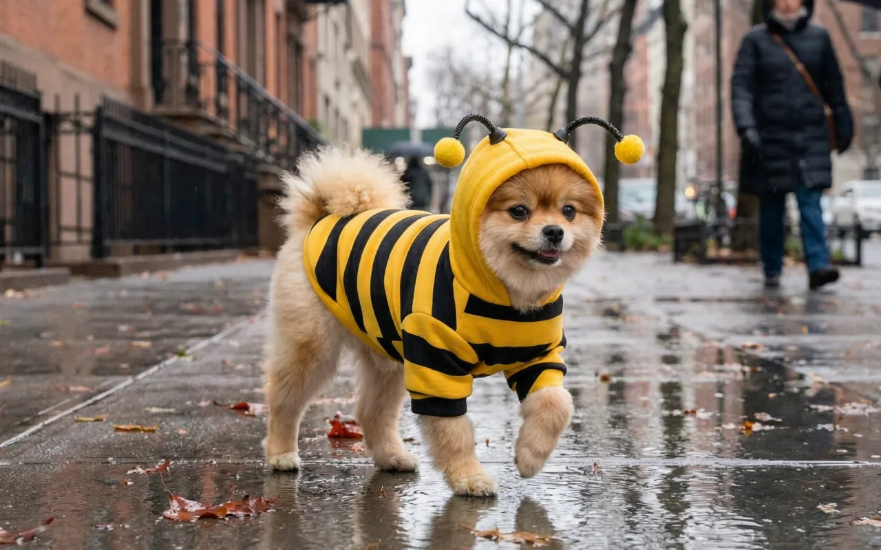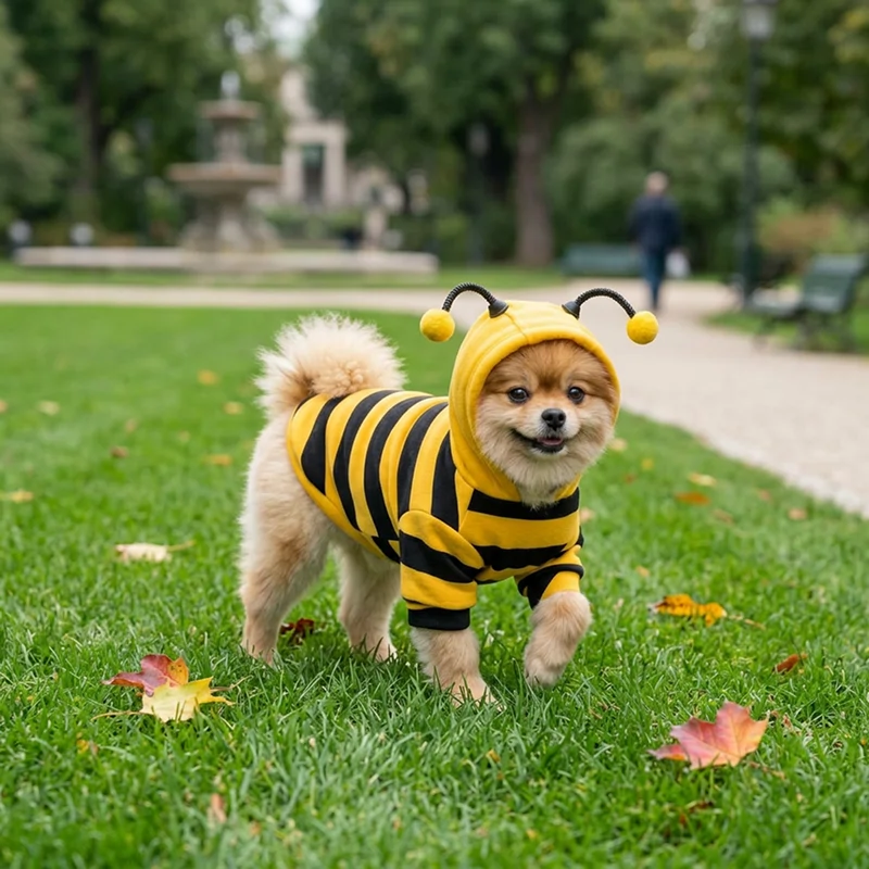 Købte bi-hættetrøjen til gåture om efteråret. Min hund ryster ikke længere, og børnene i nabolaget peger og fniser altid, når de ser ham summe ned ad gaden.