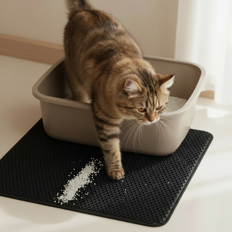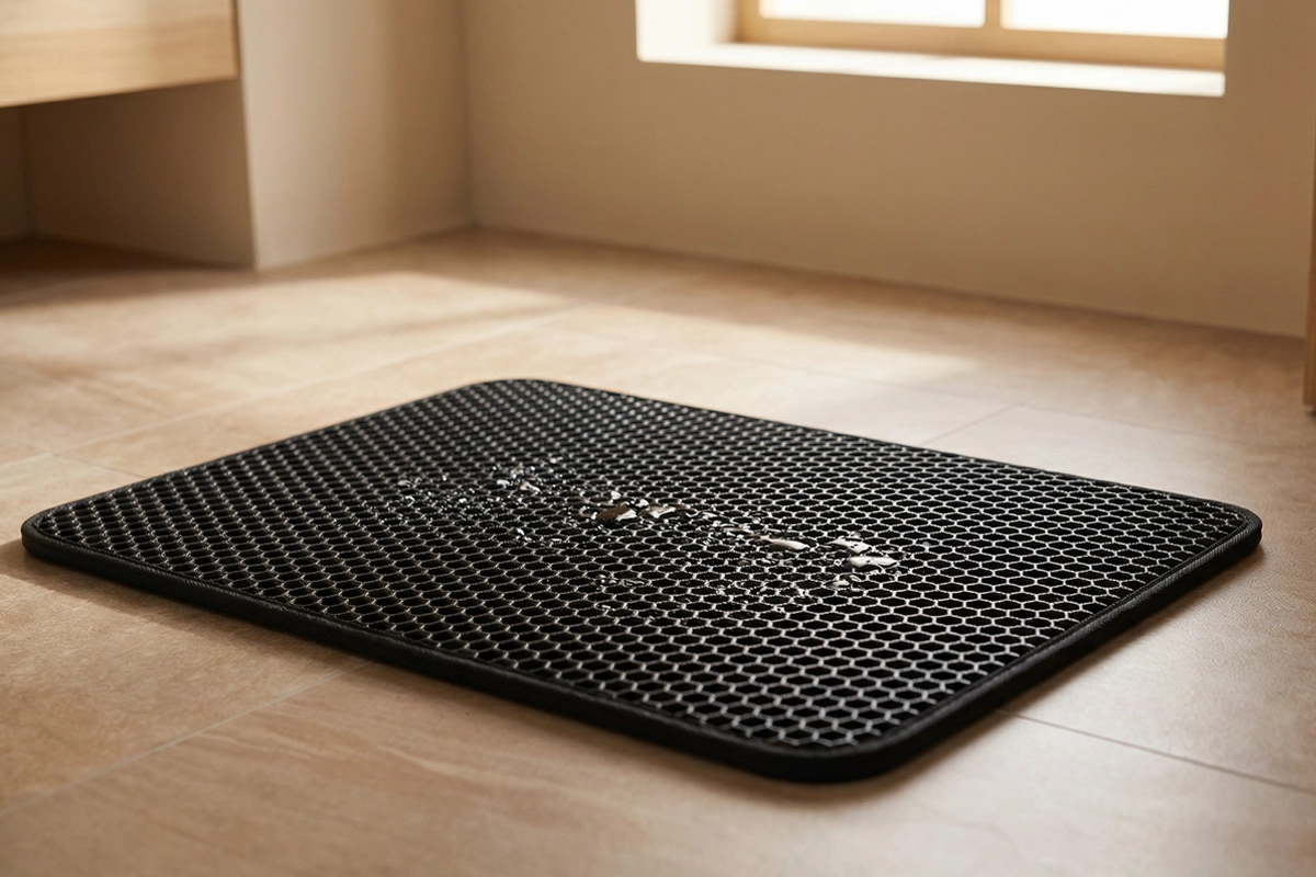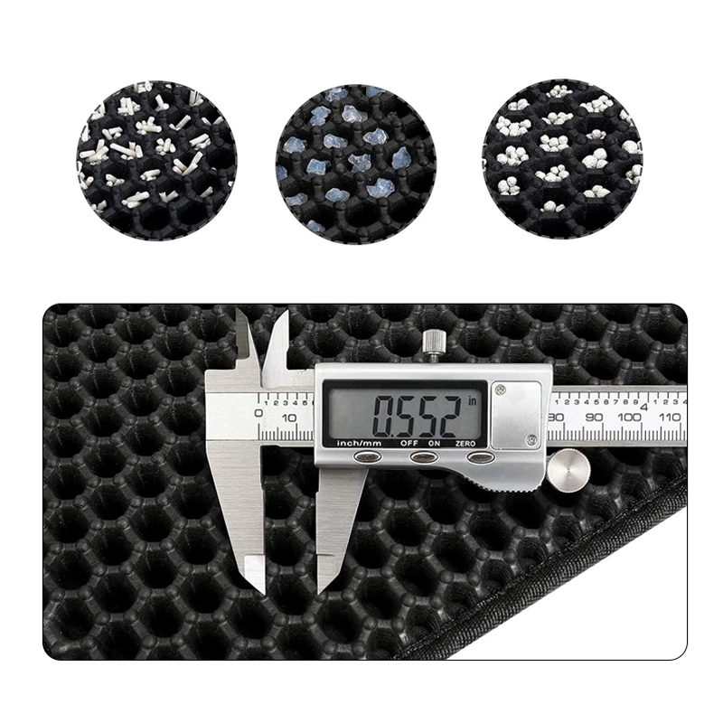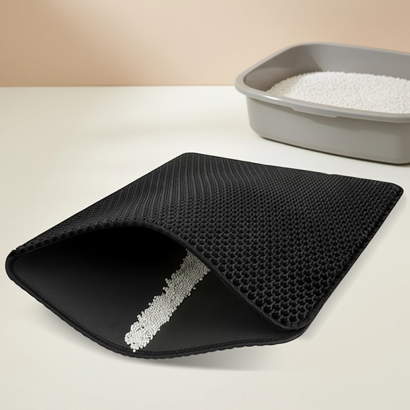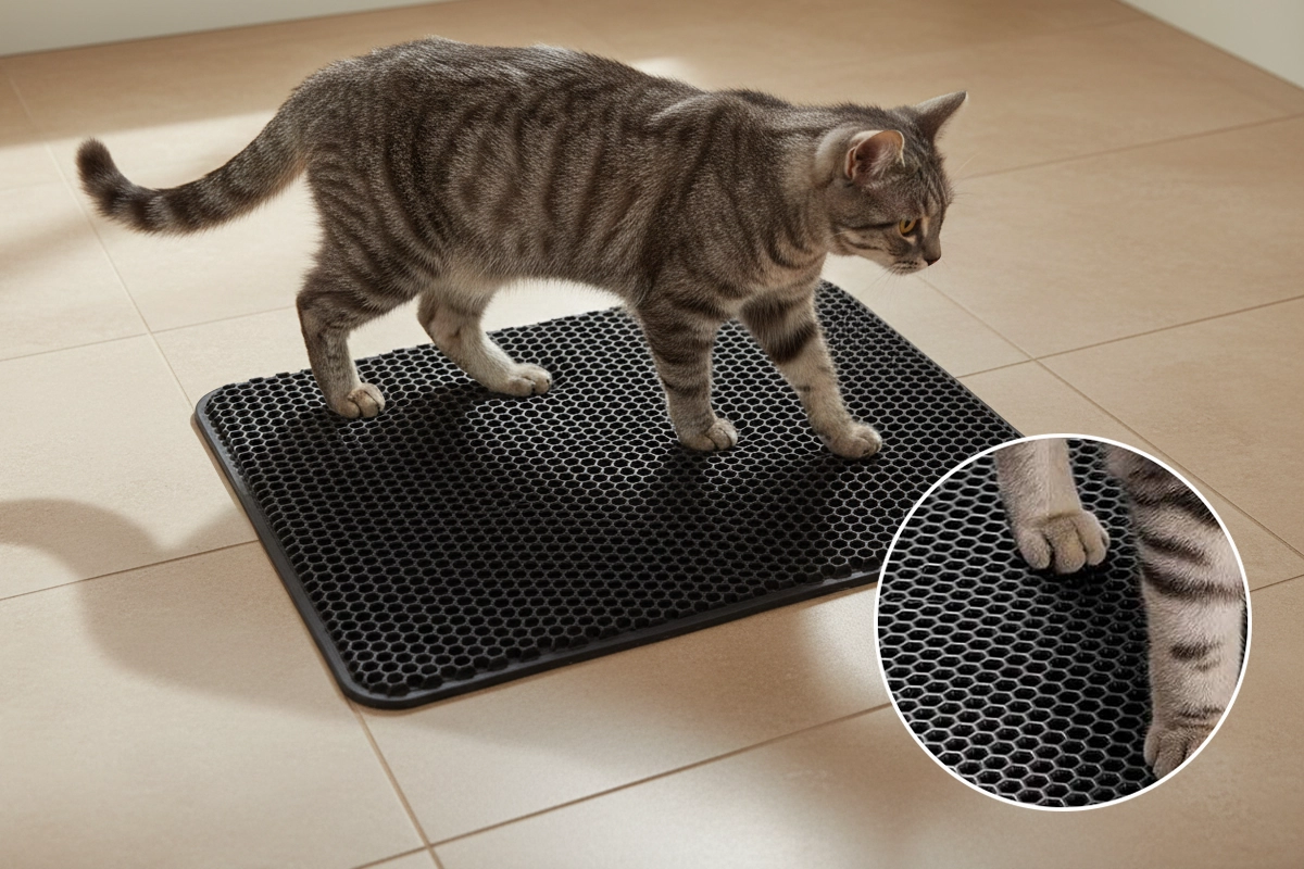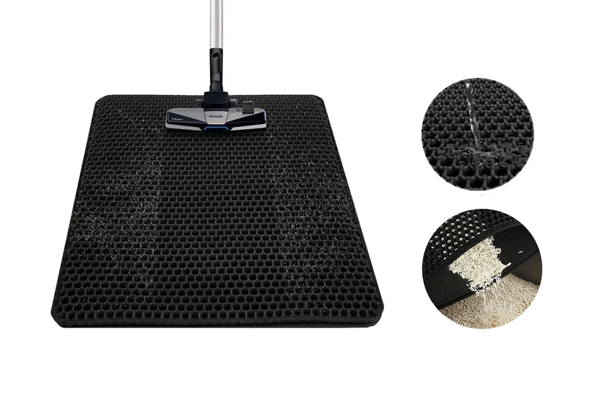 Primdog Kattebakke-Måtte gør rengøringen nem og holder poterne rene. Dens smarte bikagestruktur fanger nænsomt hvert løse korn. Ikke mere daglig fejning i hjørnerne eller bekymring om skjult snavs.