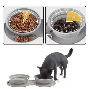 PrimDog's rejsevenlige sæt gør det hurtigt og nemt at tage sig af dit kæledyr. Det foldbare design sikrer nem opbevaring og optager minimal plads i din taske. Robust silikone garanterer pålidelig brug, selv ved hyppig rengøring. Den strukturerede inderside sænker spisetempoet, mindsker risikoen for kvælning og fremmer sunde vaner. Hver rejse bliver lettere med denne effektive løsning.