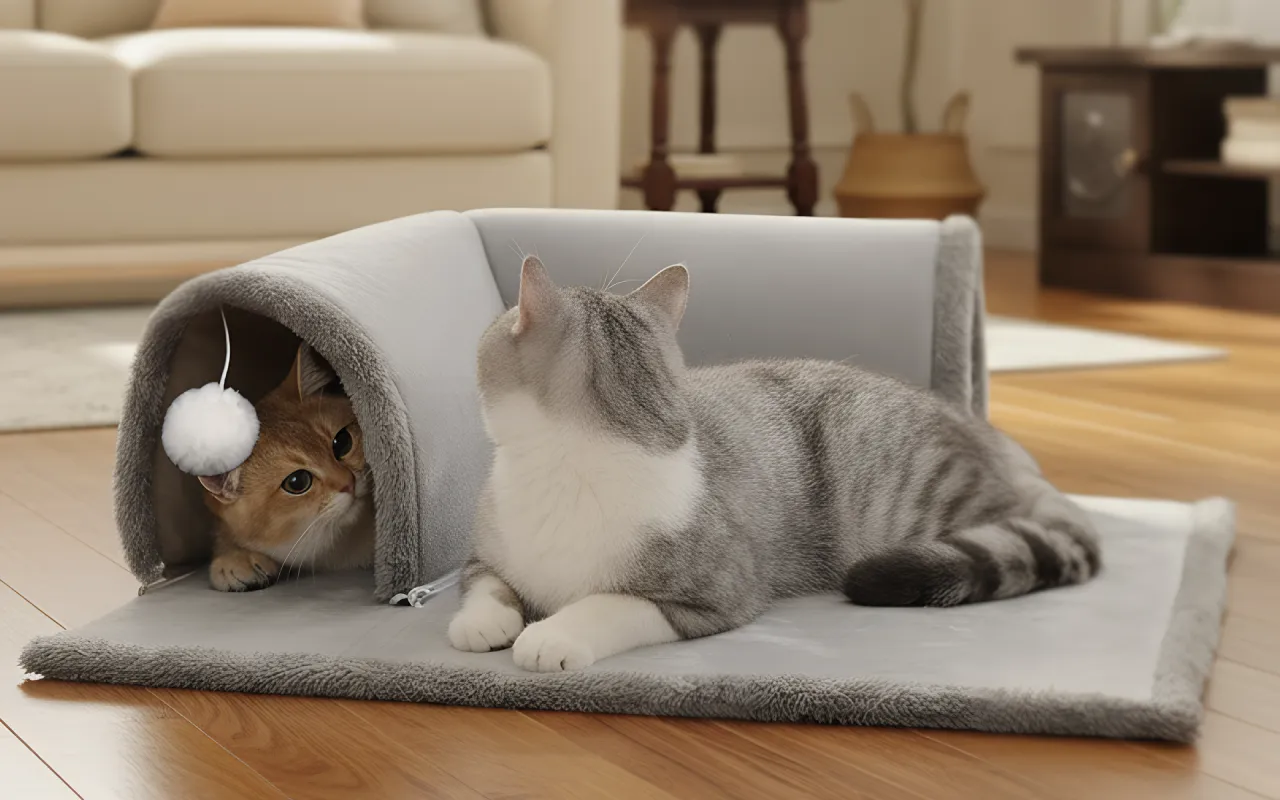 Katte kan tage en lur, gemme sig og lege, når de vil. Hængende bolde vækker begejstring under udforskning af tunnelen.