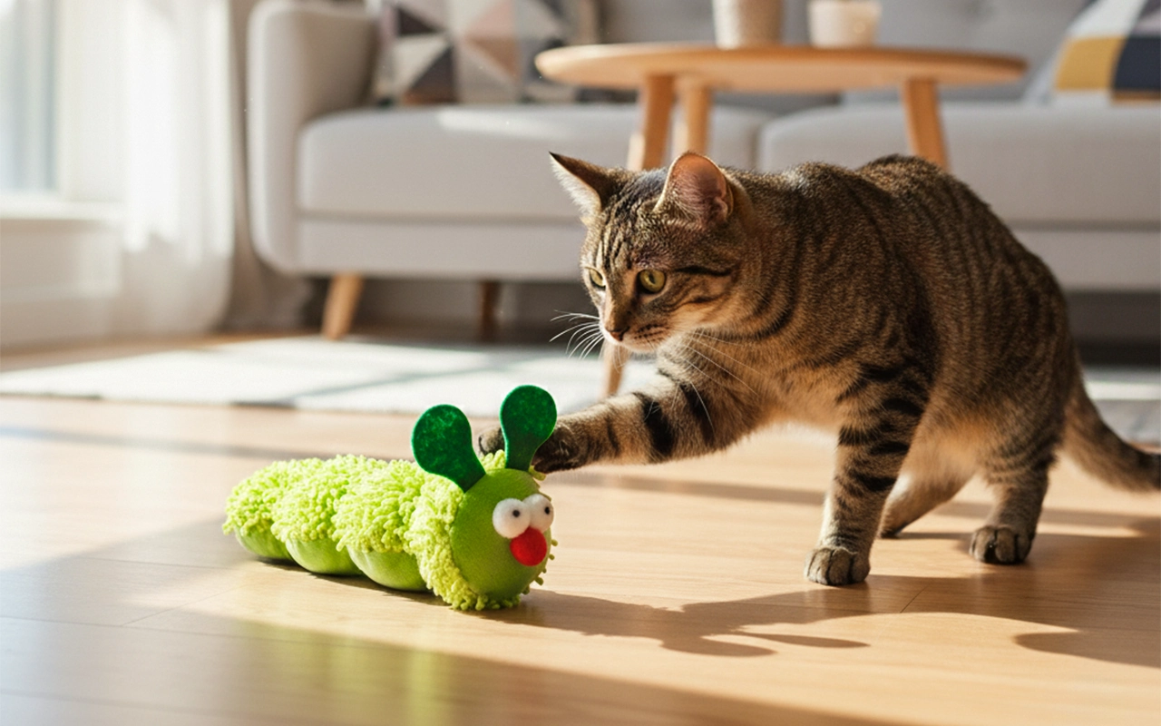 Min kat bliver helt vild med larven! Hun slår til den rundt i stuen hver dag og nogle gange sover hun ved siden af den. Den holder hende bestemt beskæftiget og glad.