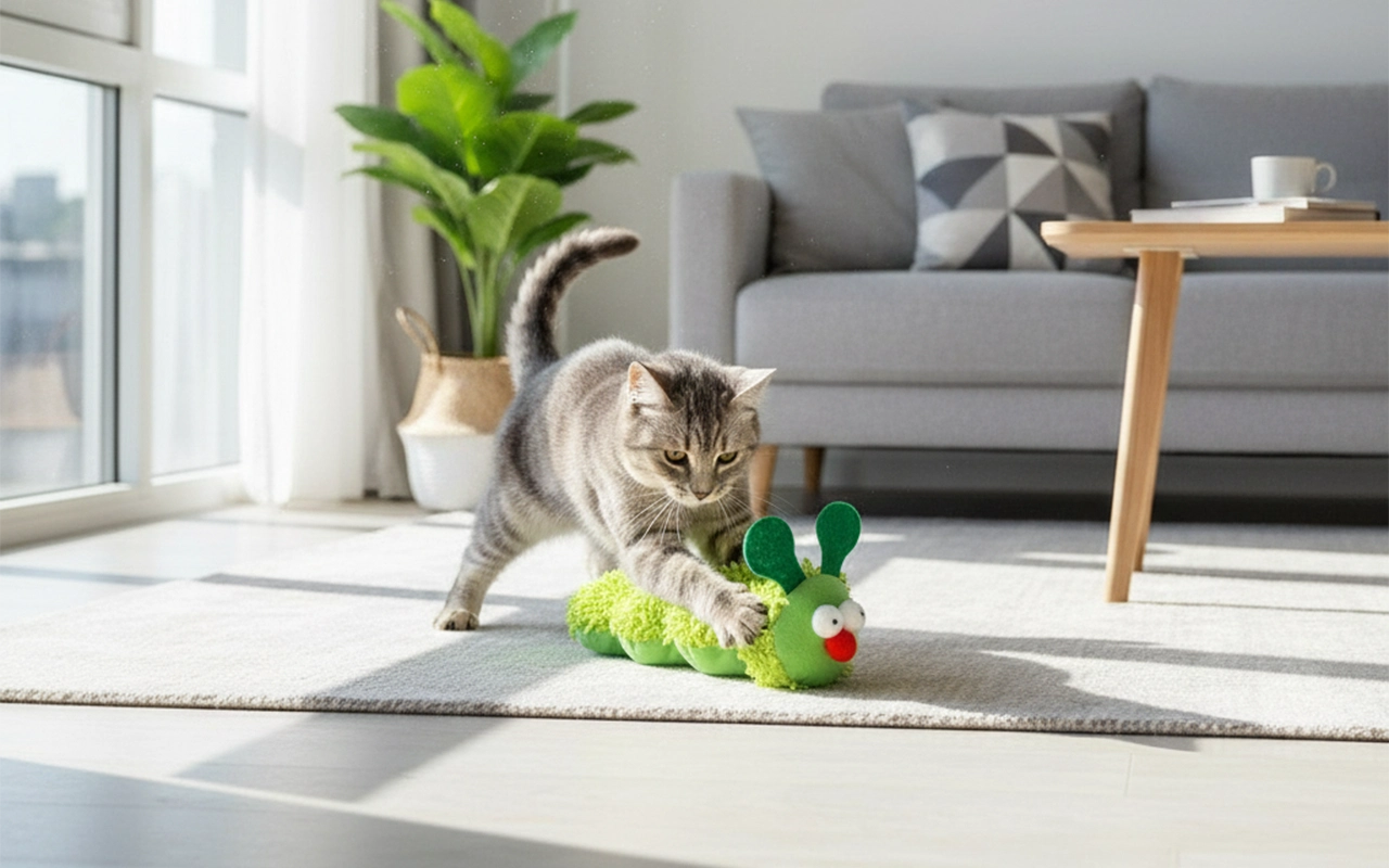 Jeg købte denne plyslarve til mine indekatte, og nu bruger de meget mere tid på at lege sammen. Det er så sjovt at se på!
