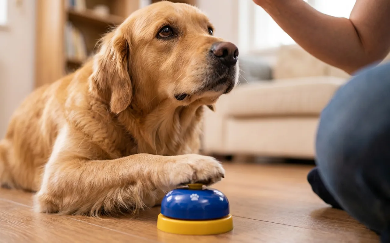 Mine børn hjælper med at træne vores hvalp med klokken. Korte daglige sessioner, masser af godbidder, og hun giver nu tegn, når hun skal ud, i stedet for at bide i tæppet.