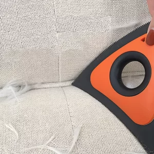 Den faste kant løfter pels fra overflader med det samme. Den arbejder nænsomt og efterlader stofferne intakte.