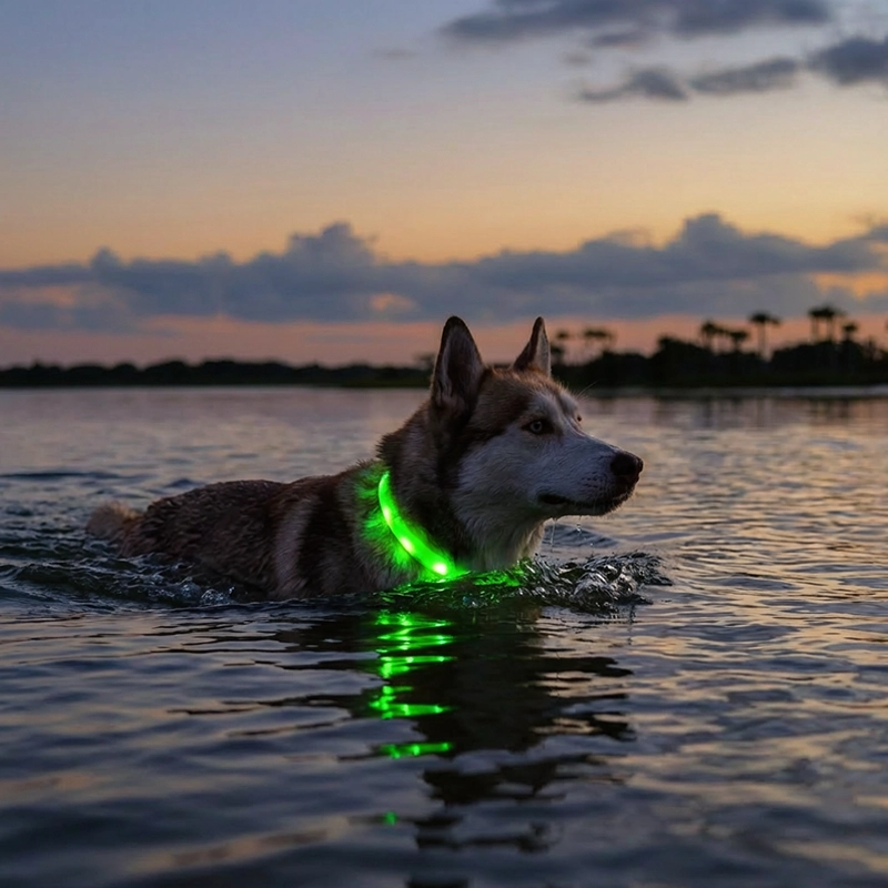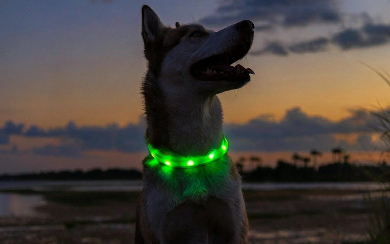 LED-halsbåndet gør det meget nemmere at finde min sorte labrador efter solnedgang. Jeg kan godt lide, at det er stænktæt til gåture ved søen.