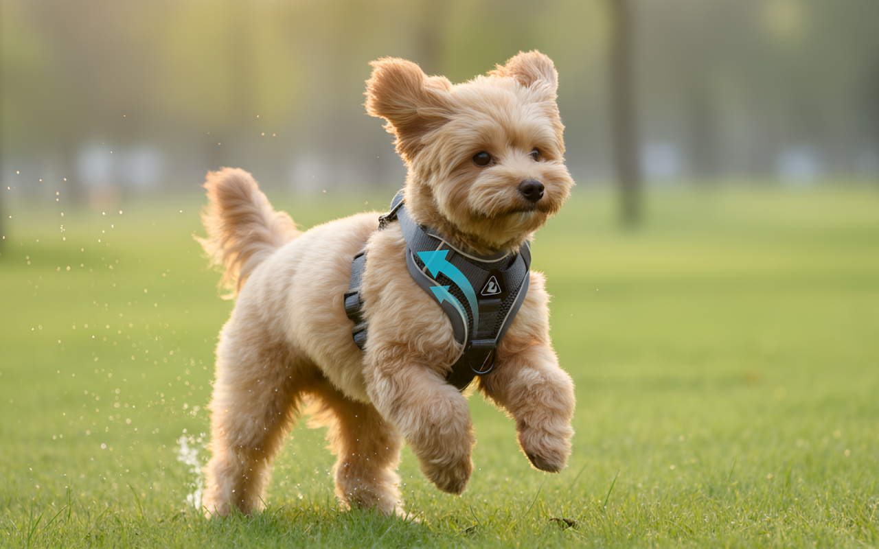 Min hvalp lægger næsten ikke mærke til, at han har denne sele på. Den forbliver kølig under leg i parken og giver mig god kontrol, når han prøver at jage egern.