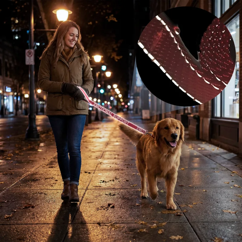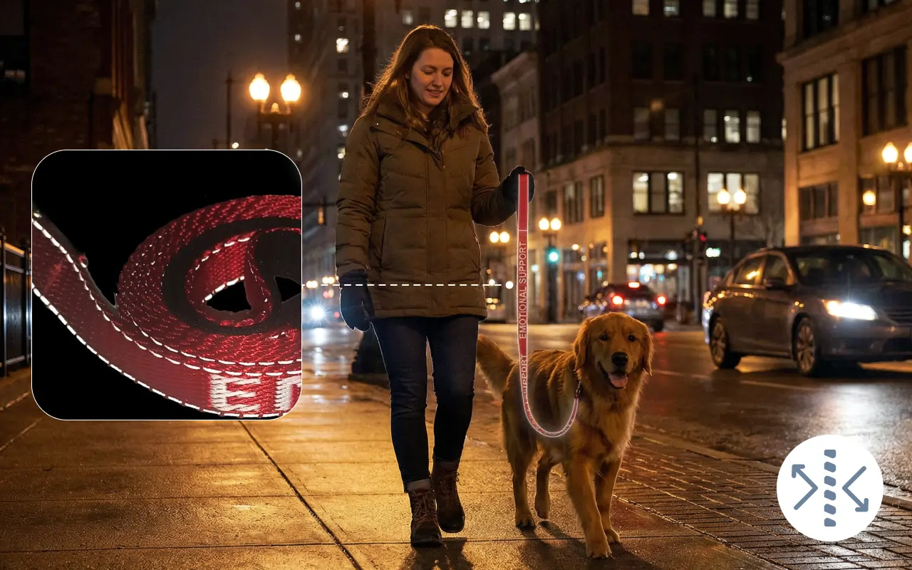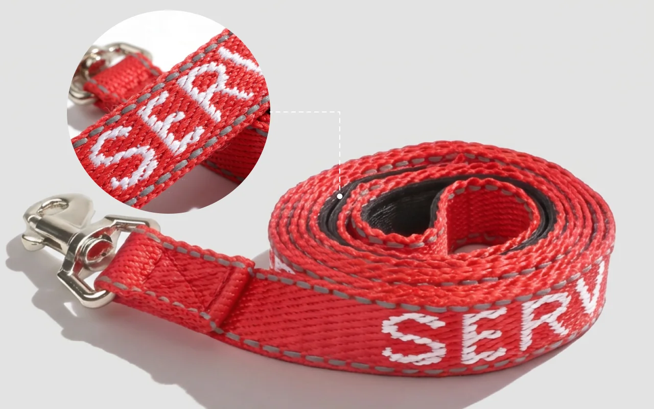 Reflekterende syninger hjælper dit kæledyr med at være synligt om natten. Den sikre metalkrog holder din hund sikker, uanset hvor du går.