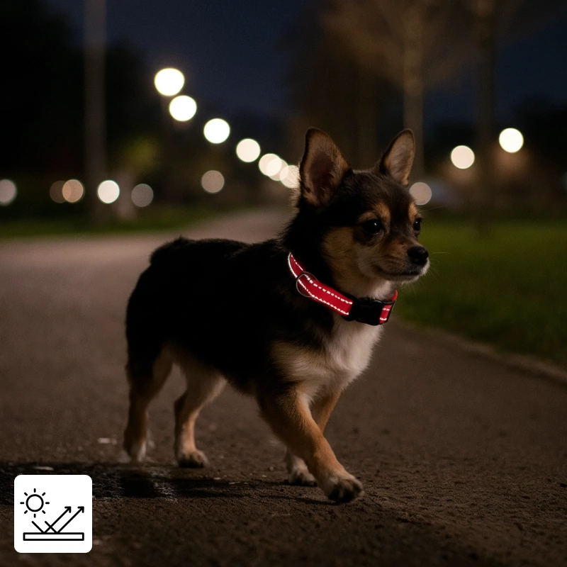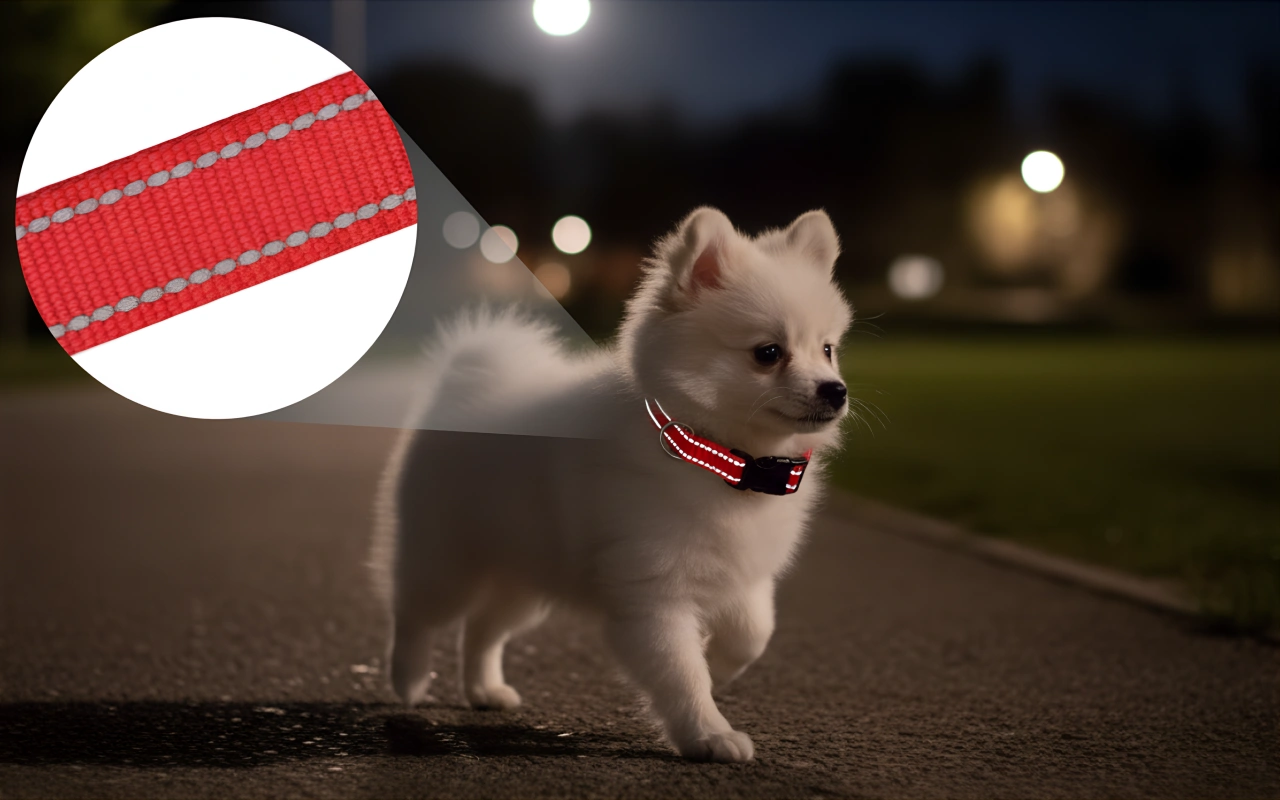 Reflekterende syninger lyser kraftigt, selv under svage lysforhold. Kæledyr forbliver synlige for bilister og cyklister efter mørkets frembrud.