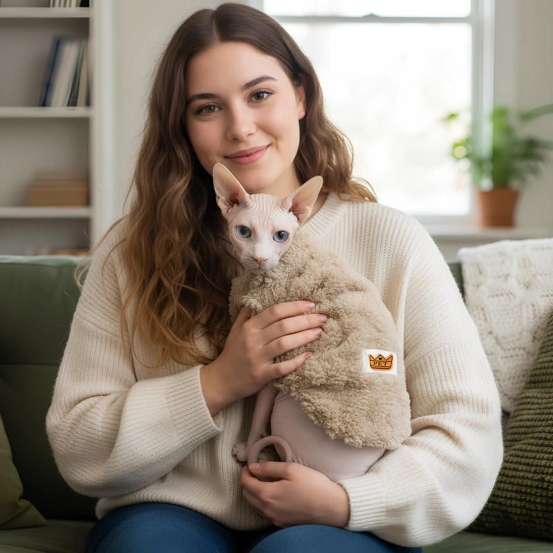 Vores ældre kat har endelig fundet en sweater, der ikke får hende til at klø. Hun sover nu meget hyggeligere og elsker at putte med os.