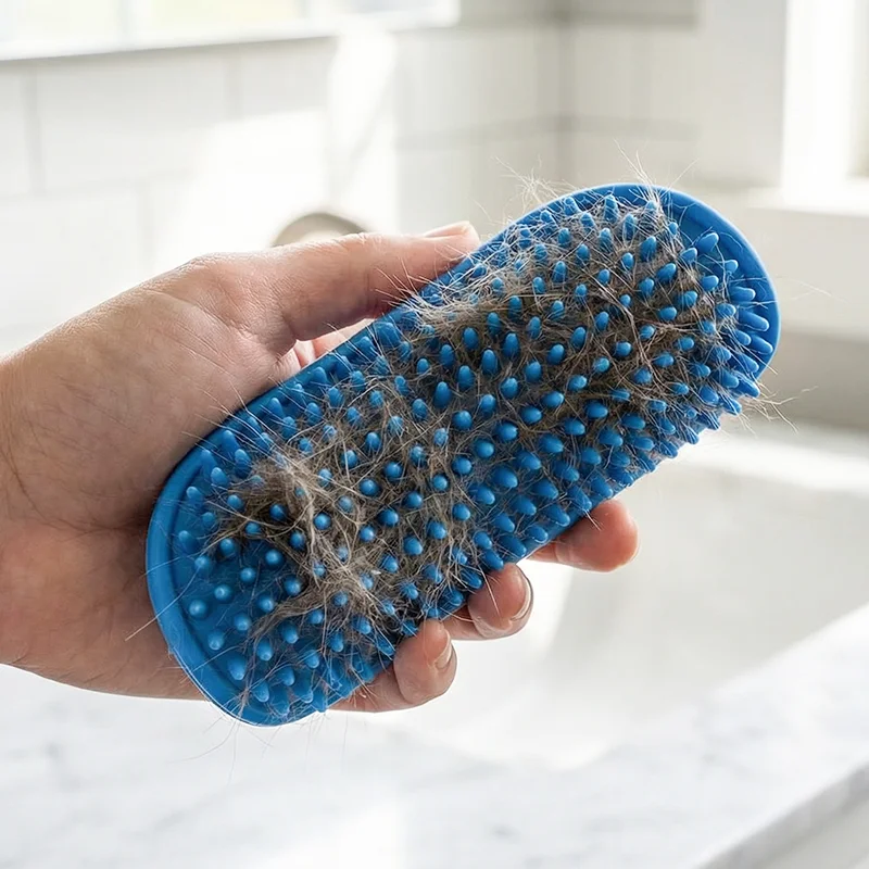 Min hund plejede at gemme sig, når det var tid til bad, men nu kommer den løbende! Skrubberen er behagelig og hjælper endda med at fjerne masser af løse hår.