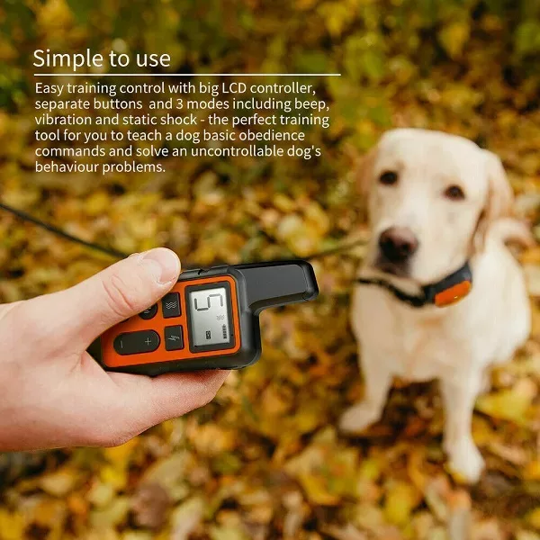 Med en kontrolafstand på 300-500 meter og 3 korrigeringsfunktioner (Stød, Vibration, Tone) kan du fuldt ud tilpasse den ønskede træning efter dine specifikke behov. Med 5 justerbare niveauer for vibration og stød kan du finjustere korrigeringsniveauet for at opnå positive resultater med enhver hund. LCD-fjernbetjeningen viser tydeligt tilstand, niveau og batterilevetid. De 3 tydelige funktionsknapper giver dig mulighed for hurtigt at korrigere din hund, mens den opfører sig dårligt, uden at skulle kigge ned på enheden.
