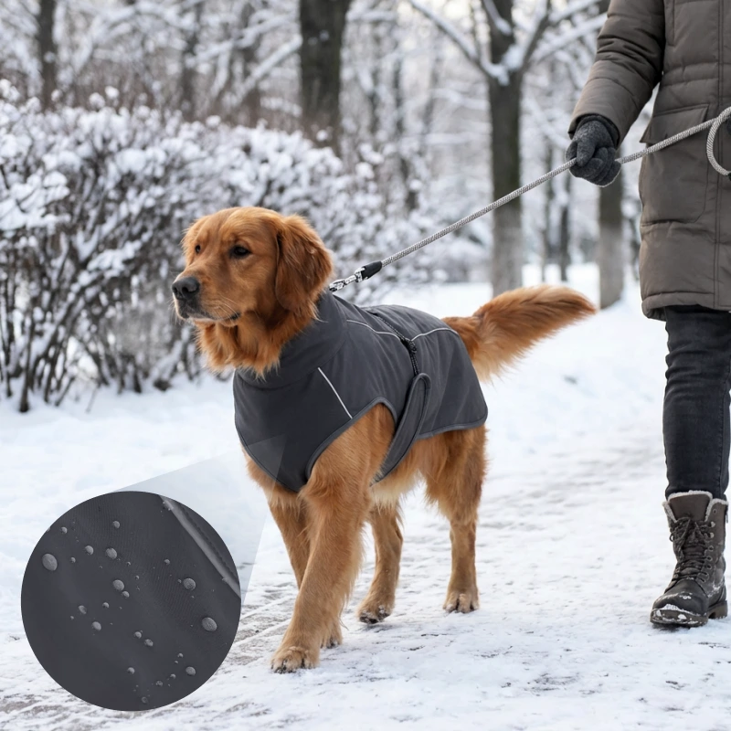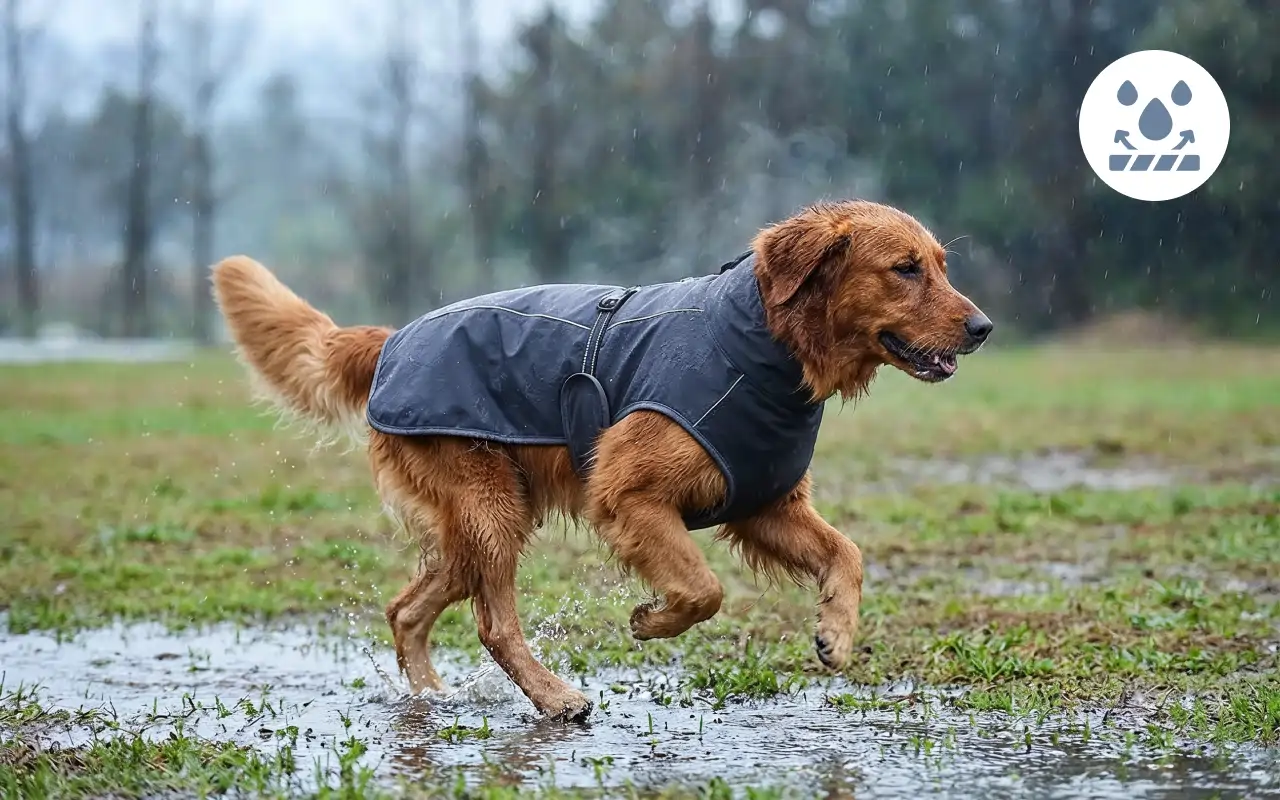 Stoffer forhindrer vand i at trænge igennem efter regn eller sne. Hunde forbliver tørre, glade og klar til sjov overalt.