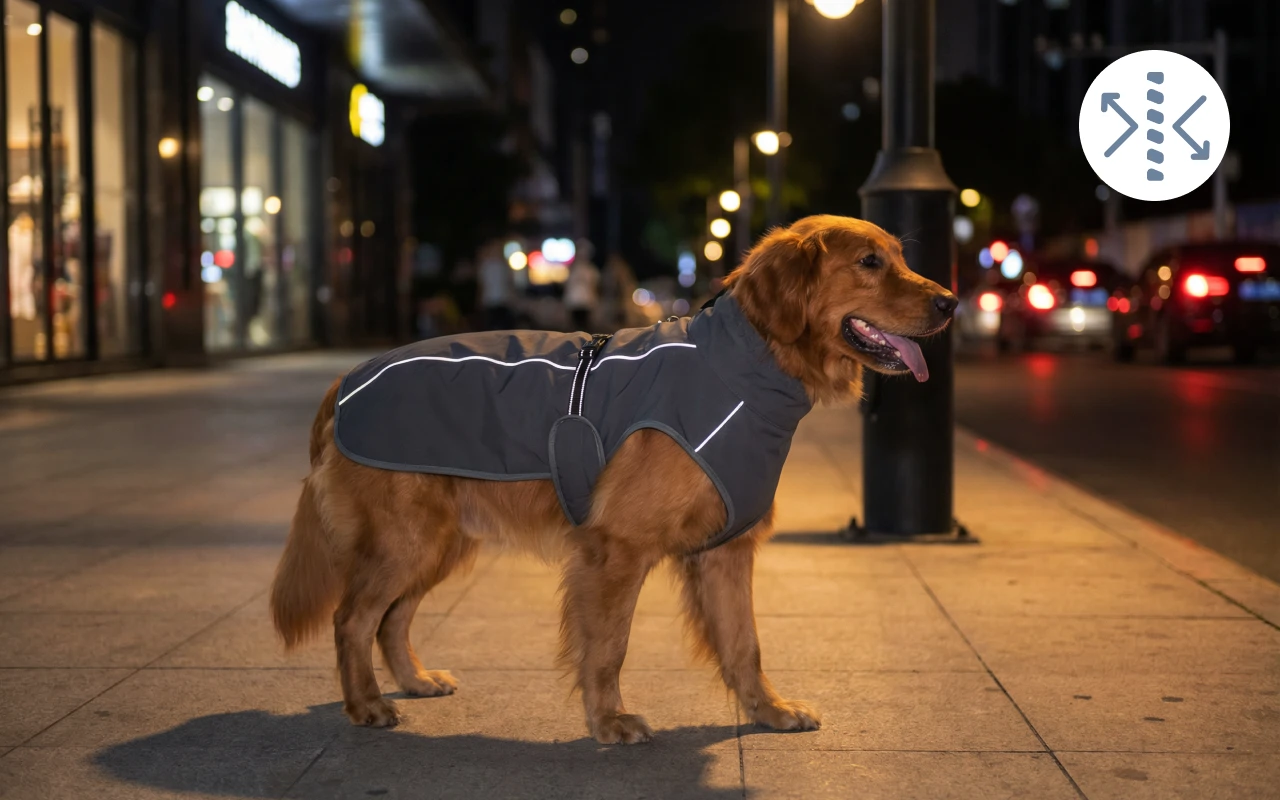 Reflekterende detaljer lyser kraftigt op, når billygter passerer forbi. Aftenture bliver mere sikre for både ejere og legesyge hunde.